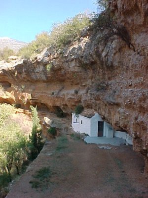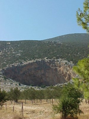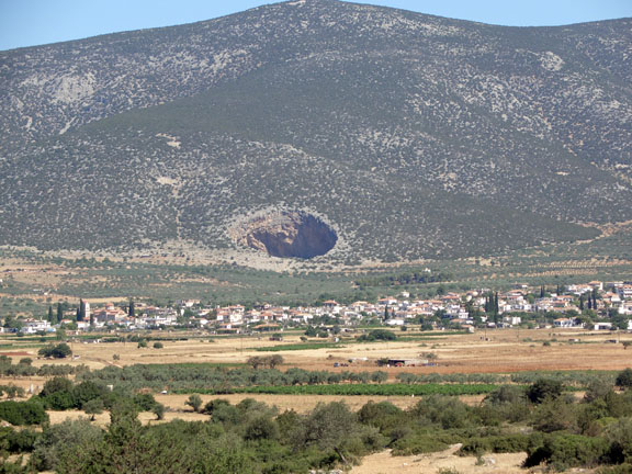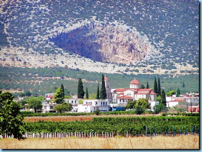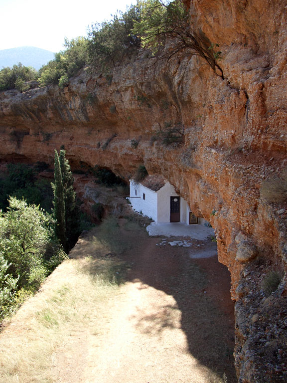 Ca. 20km nördlich von Kranidi Westlich der Ortschaft, an der Bergflanke ist eine der weltweit größten Dolinen (Erdfälle) schon von weitem sichtbar. Einige hundert Meter vor dieser befindet sich eine zweite Doline von über 100m Durchmesser und 50m Tiefe. Ein Zugang unter der Erdoberfläche führt ins Innere zu einer gut begehbaren Innenwand, wo Eremiten-Mönche ein Kirchlein und eine kleine Einsiedelei erbauten.