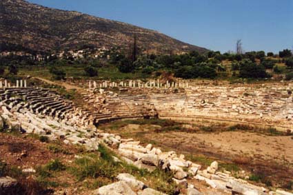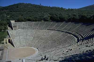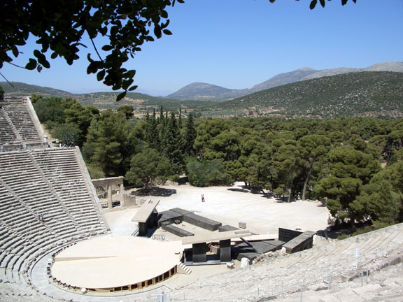 Epidauros ist natürlich besonders berühmt wegen des großen Amphitheaters, das rund 300 v.Chr. gebaut wurde. Es ist sehr gut erhalten - eigentlich besser als alle anderen griechischen Amphitheater. Auch heutzutage finden dort Aufführungen statt. Wir haben uns die eine oder andere angesehen und können nur sagen: "Das muss man erlebt haben." Immerhin ist da Platz für ca. 12.000 Zuschauer! Und alle können hören, was man auf der "Orchestra" sagt. Ein kleiner Tipp für Sie: Setzen Sie sich auf die letzte Reihe, ganz oben, und bitten jemanden, eine Münze auf den Stein, der in der Mitte der Orchestra liegt, zu werfen. Und jetzt erraten Sie, ob Sie das hören werden oder nicht...